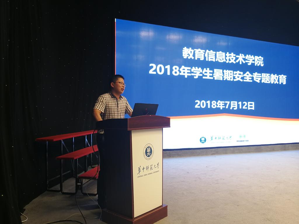 教育信息技术学院讯(记者 杨晨曦)为贯彻落实暑假期间学校对于学生安全教育及管理工作方面的要求,确保我院同学能够提高自我防护意识,度过一个安全愉快的假期,7月13日中午,我院在9号楼6楼演播厅举办2018年学生暑假安全专题教育讲座。出席本次会议的有我院党委副书记钟文锐、2016级辅导员张竹张竹、2015级辅导员冯远航,在校全体本科生参加此次讲座。