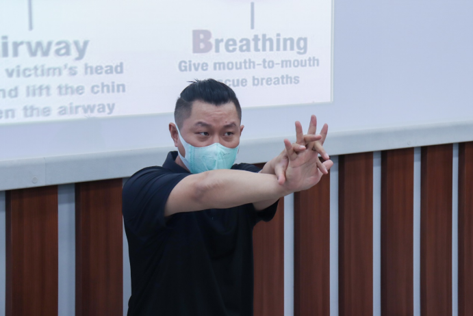 授旗仪式后,蓝天救援队队员王翔为全体实践队员进行安全知识培训。他着重介绍了心肺复苏、气道异物梗阻急救等概念和基本操作方式,提醒全体参会成员重视自身及他人生命安全,以合理的方式应对活动中可能出现的各种情况。王翔通过亲身示范指导学生学习正确的急救步骤、姿势,并邀请学生上台体验,近距离、全方位地接触急救器械、了解急救知识。