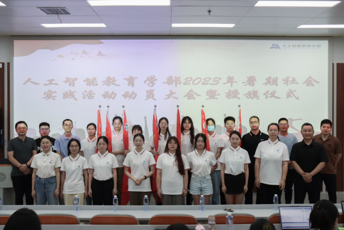 为深入学习贯彻习近平新时代中国特色社会主义思想,落实党的二十大精神,鼓励青年学生积极投身基层、服务社会,提高青年学生的专业能力和核心素养,人工智能教育学部2023年暑期社会实践活动动员大会暨授旗仪式于6月25日14时在南湖综合楼N307教室召开。人工智能教育学部党委书记黄涛,副院长童名文,数字媒体技术系主任陈迪,人工智能教育学部副教授谭政、邓伟,团委副书记张志、金宇晖,学部教师、国家应急救援员、蓝天救援队教官王翔老师出席仪式。人工智能教育学部团委书记汪双担任仪式主持人。