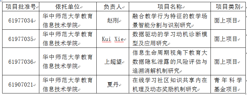 教育信息技术学院讯 8月16日,2019年度国家自然科学基金申请项目立项结果公布,我院4位教师喜获立项,其中面上项目3项、青年科学基金项目1项,获批资助直接费用共计168万元,开创了我院同年获得国家自科基金立项数和资助金额总量历史新高。