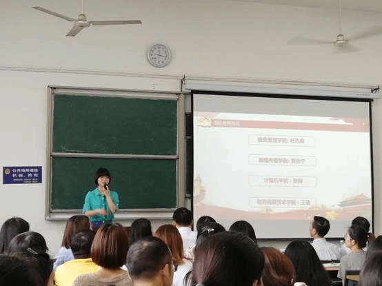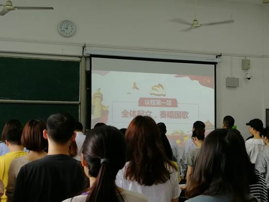开班典礼由教育信息技术学院党务干事王潘同志主持。首先,进行第一项议程,伴随着激昂的国歌声,全场起立齐唱国歌。