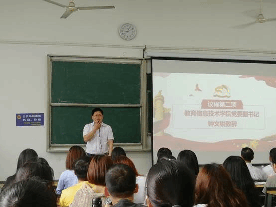 随后,教育信息技术学院党委副书记钟文锐同志代表承办单位致辞。钟书记对在座的学员表示祝贺,并阐述了举办发展对象培训班的重要意义。他对全体学员提出了三点要求:一是珍惜学习机会,严守学习纪律;二是以此次培训为契机,进一步端正入党动机;三是带头讲政治、守规矩,牢固树立“四个意识”,增进“四个自信”。希望学员们不忘初心,牢记使命,争取以实际行动早日成为一名光荣的共产党员。