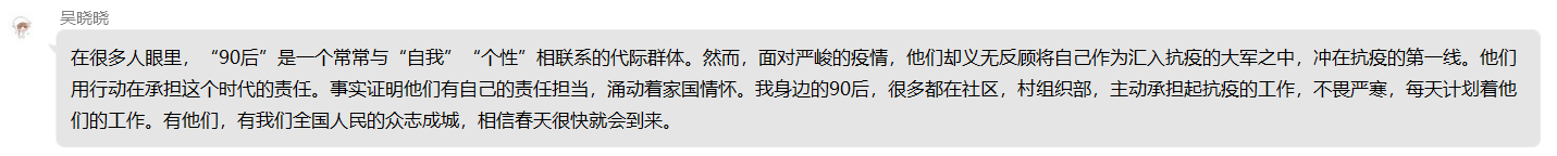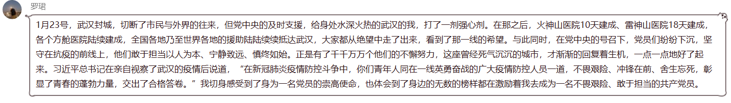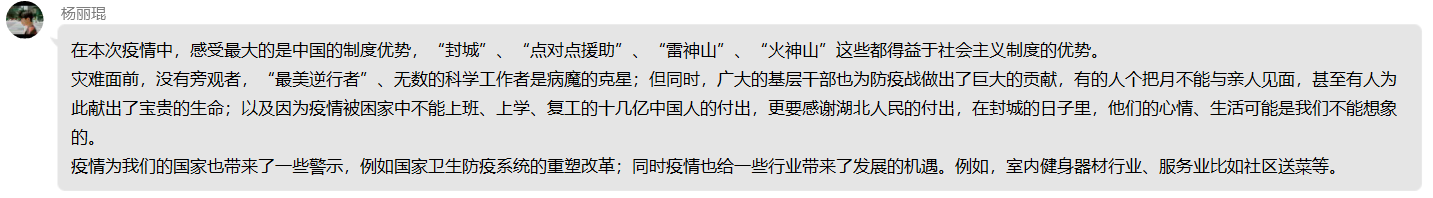 高扬谈到:“通过这次疫情,我更为自己是一名中国人而自豪,因为我们国家在疫情面前集全国之力、众志成城抗击疫情,从全国各地调拨物资、借调医护人员到武汉,体现了我们国家的制度优势;通过这次疫情,我更明确了作为一名党员的担当,就是国家与人民需要你的时候,你就要站出来肩负起自己的责任和使命。作为共产党员,我们要全面贯彻党和中央的决策部署,没有开学指示之前,咱们一定要耐住性子,在家认真完成论文撰写,为疫情防控工作贡献自己的一份力量。”