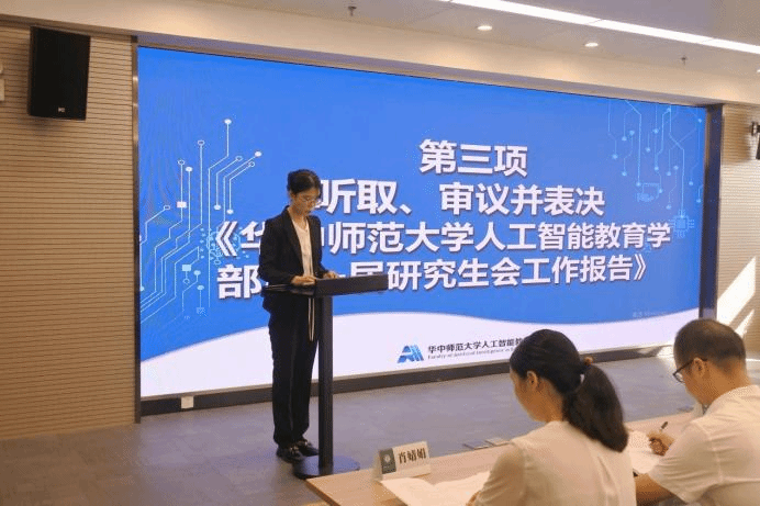 随后,与会人员听取、审议并表决《华中师范大学人工智能教育学部第一次研究生代表大会提案工作报告》。