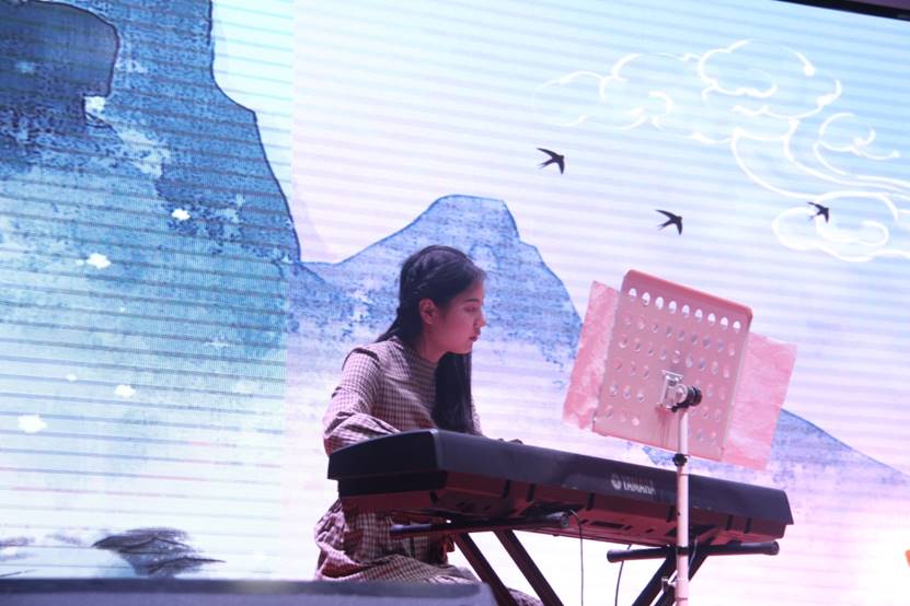 独舞《咏荷》开启“寻梦不止”篇章,诗情画意;《谁来剪月光》悠扬琴曲与多情歌喉相得益彰,师生合作进行“你画我猜”游戏及现场抽奖环节将现场气氛带到高潮。由京剧社带来京剧表演令人耳目一新,花旦多姿,老生庄严。