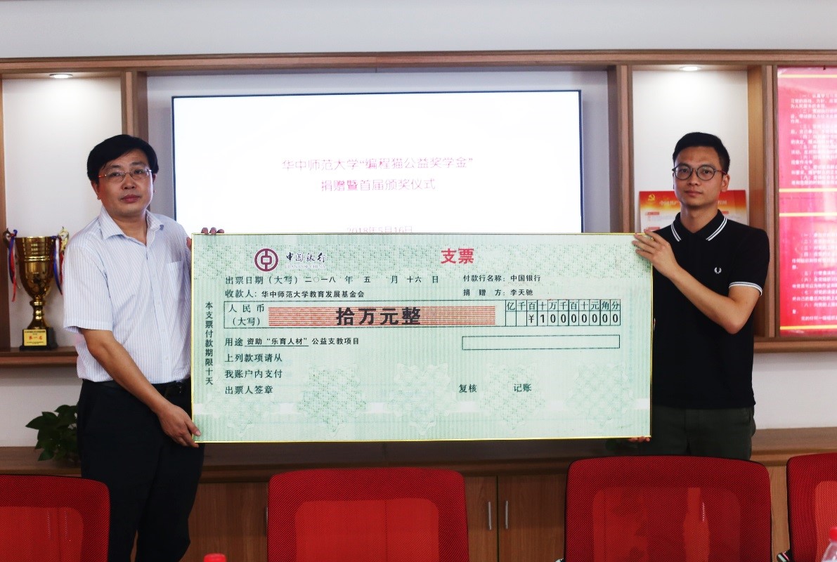 接下来,校团委副书记麻旎宣读《关于表彰2018年华中师范大学“编程猫公益奖学金”获得者的决定》,李天驰为获奖学生颁发证书。优秀志愿者代表及“乐育人材”项目负责人之一刘宇杰在发言中表示,作为青年一代大学生,他们有理想、有热情,相信星星之火可以燎原。在未来,他会将这份爱心与奉献精神一直传递下去,不忘初心,砥砺前行。