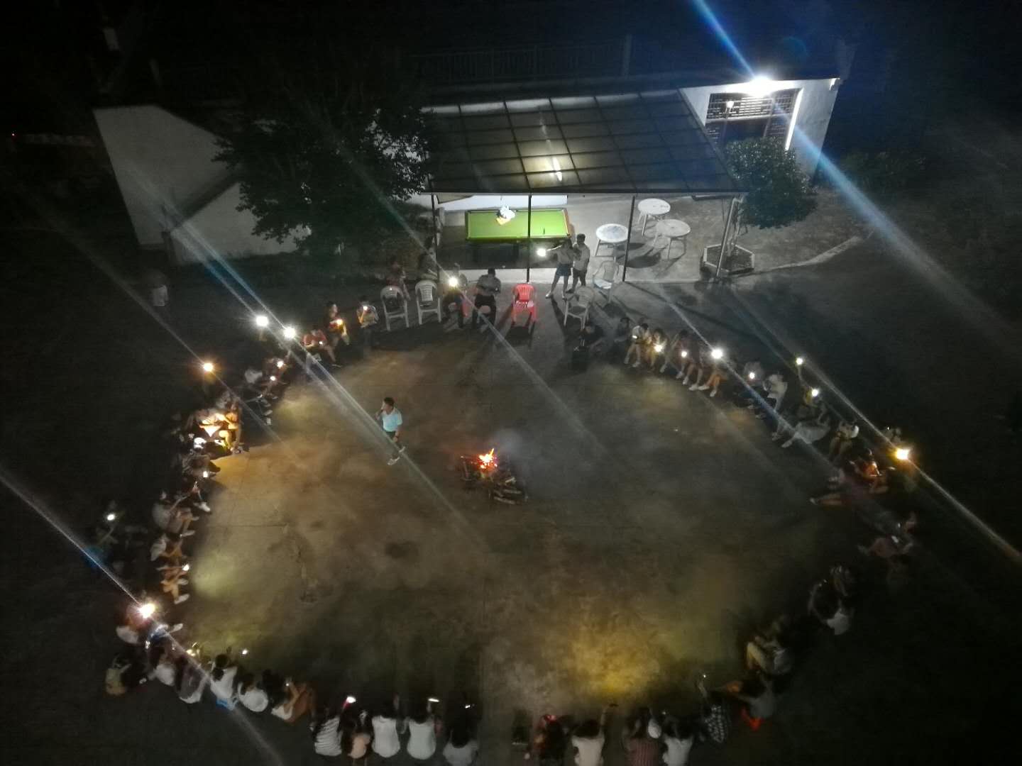 至晚上七点半,一场师生期待已久的篝火晚会在写生基地前的小广场上举行。在场同学带来了精彩的歌曲表演,实验中心副主任黄勃即兴演唱一首饱含真挚情感的《绒花》。在现场观众的欢呼声中,王翔和谭政老师带来的一曲《当》,更是将这次晚会的气氛推向了高潮。