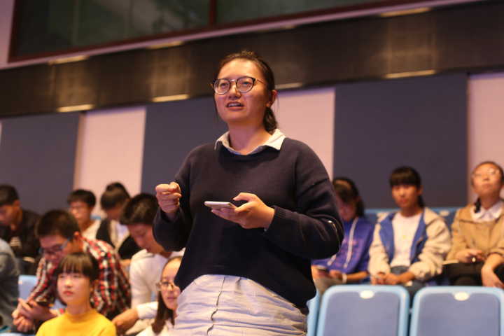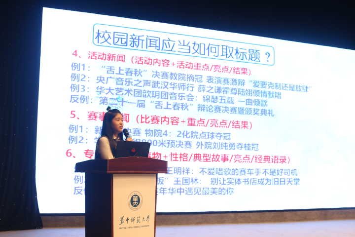 随后,吴琼为在场的团学干事讲解新闻宣传工作的相关内容。她的专题讲座分为四个部分。第一部分是学生记者的必备技能,她表示学生记者要有新闻敏感性,对新闻要有自己独特的观点和见解,同时要敢于发问和采访,要有广泛的兴趣和知识面,及时敏锐地发现新闻线索。她在第二部分分享道,新闻具有时效性和真实性,新闻稿最重要的就是用最简洁的话语描述最多的事情并用几个反例指出了新闻稿中的两个错误:过多华丽的辞藻和流水账式记叙。同时指出新闻的核心价值是真实,而“发现”是好新闻的前提。而后,就有关采访和撰写的内容分享,宣传工作中,采访是新闻的关键,而撰写是新闻的基础。在讲座最后的提问环节中,团学干事的积极提出自己的不懂和更想了解的内容,吴琼耐心地一一作出了解答。
