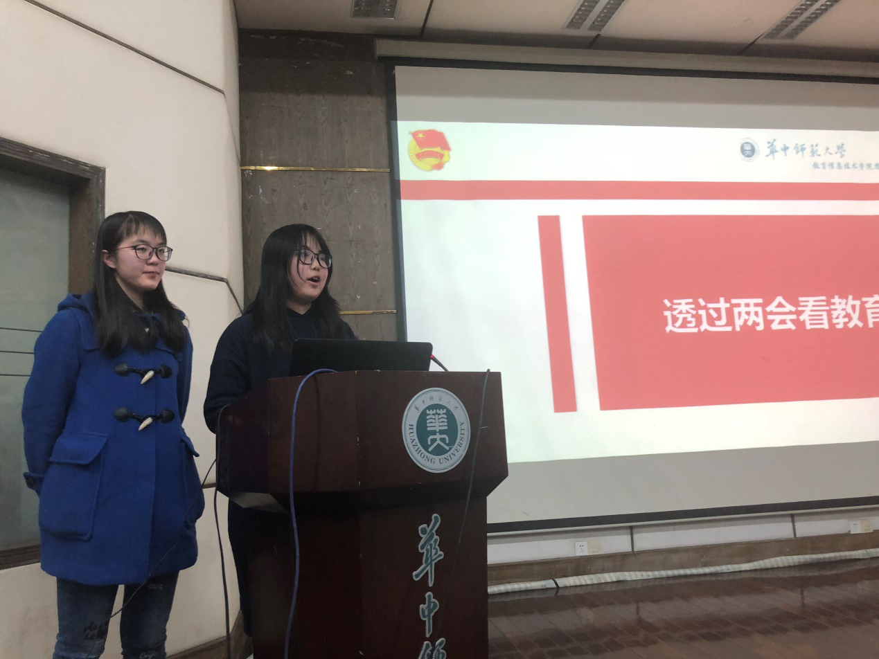 教育信息技术学院讯(记者 郝明霞)3月24日晚,由我院团委、学生会主办的主题教育活动“透过两会看教育”在九号楼一楼报告厅举行。我院团委书记兼2018级辅导员胡尉尉、团委副书记兼2017级辅导员陈亮和我院2017级、2018级全体本科生参与此次活动。本次活动由马列研究分会成员李汇之、王雨欣主讲。