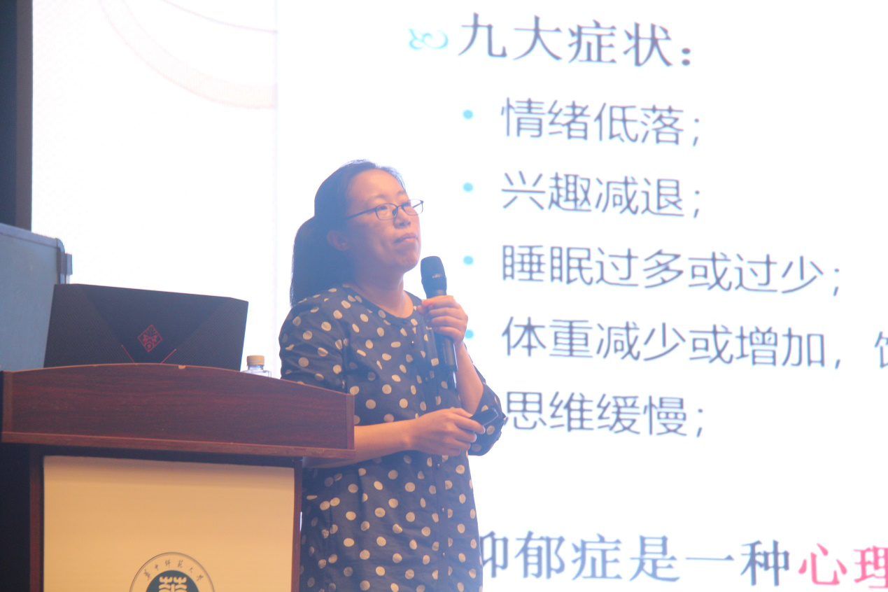 紧接着,她讲解了心理危机的三大表现:有自杀风险、有精神障碍、遭遇重大负性事件导致严重应激反应,又分别详细讲解了这三方面的主要表现。她特别讲解了抑郁症,因为现今抑郁症在大学生中的发生率十分高,她用一个小短片生动的展示了什么是抑郁症及如何应对它。随后,她讲解了一些在精神障碍及心理问题方面普遍存在的误区,如抑郁症是否可以被治愈等。她讲到可以从常识性的三个方面发现身边是否存在有心理危机的人,分别是认知、情绪、行为。