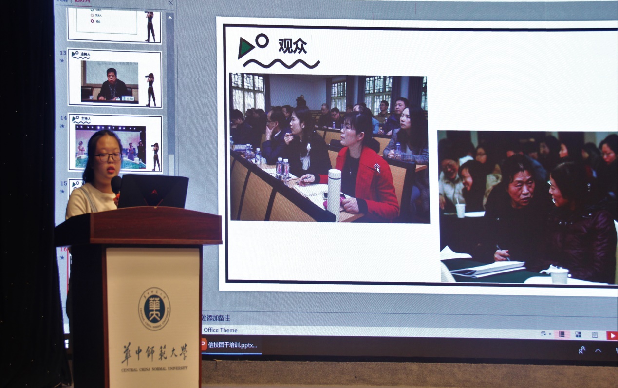 教育信息技术学院讯 (见习记者 郑懿容)为了提高团干部的工作能力,强化团干部政治意识,10月28日晚我院在九号楼演播厅开展了第二次团校培训。其内容包括恽代英精神的解读与传承及新闻摄影的要点。由恽代英菁英学校第五期文体委员彭媛、华大记者团摄影组陈星雨主讲,2019级全体团委学生会成员参加了此次活动。