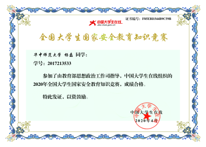 由公共安全领域专家、中国工程院院士范维澄讲授的《总体国家安全观视角下的疫情防控》于4月14日正式上线。教育信息技术学院于4月15日前组织全体学生在相关平台、网站,错峰错时观看学习了2020年全民国家安全教育日高校公开课。通过听讲,同学们进一步准确把握了国家安全形势,牢固树立总体国家安全观,提升国家安全意识。多数学生积极参与中国大学生在线等单位开展的国家安全知识在线问答活动中,取得知识竞赛合格证书。
