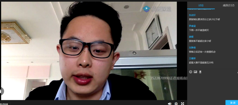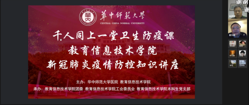 2020年4月12日晚,为深入学习贯彻落实习近平总书记关于疫情防控系列重要讲话精神,增强师生疫情防控意识,有效预防疫情传播,切实做好复工复学防护,我院以在线上直播的形式举办了新冠肺炎疫情防控知识讲座。副校长夏立新、校医院副院长王声萍、我院党委书记游丽、院长刘清堂、党委副书记钟文锐出席。学院全体在职教师、离退休教师、全体研究生和本科生在线聆听讲座,在线收看人数高达7200多人。