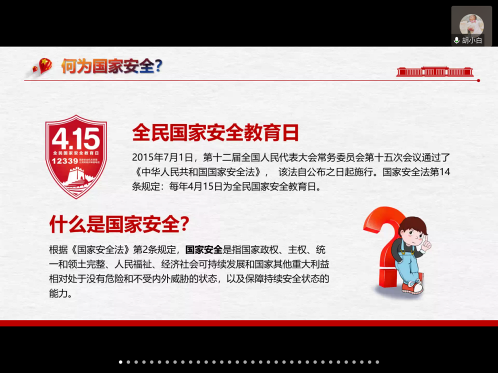 2018级辅导员胡尉尉于4月19日晚点名时间通过腾讯会议组织开展国家安全主题教育。课程中,胡尉尉提到,“作为中国二十一世纪的大学生,维护国家安全是义不容辞的责任,也是党和国家对每个大学生的基本要求。要增强国家安全意识,学习国家安全法律知识,切实履行维护国家安全的法律义务,成为国家安全和利益的自觉维护者”。
