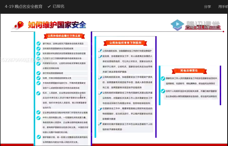 为将宣传教育活动贯穿到日常思想政治教育工作中,进一步贯彻落实总体国家安全观,教育信息技术学院组织制定了主题为《增强国家安全意识 共同维护国家安全》的课件和讲义,并在各年级通过线上晚点名方式开展主题教育。
