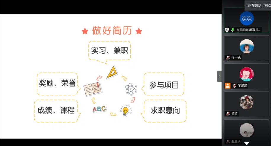 活动伊始,王潘老师给我们分享了她对于求职的一些经验和看法,告诉我们想要找到好工作还是那句老生常谈但最有用的话,学好专业知识,锻炼综合能力。刘欢欢学姐告诉我们求职第一步要做的就是根据个人兴趣和能力,确定明确的目标和城市,明确了目标才能早做准备,而每个城市的招聘黄金时间是不一样的,所以需要根据自己的理想城市进行相应的安排。并且刘欢欢学姐还提到丰富简历的重要性,所以在研究生阶段需要多锻炼自己,参加实习和获得证书都能为自己的简历加很多分,这样在简历投递时才能占据先机。