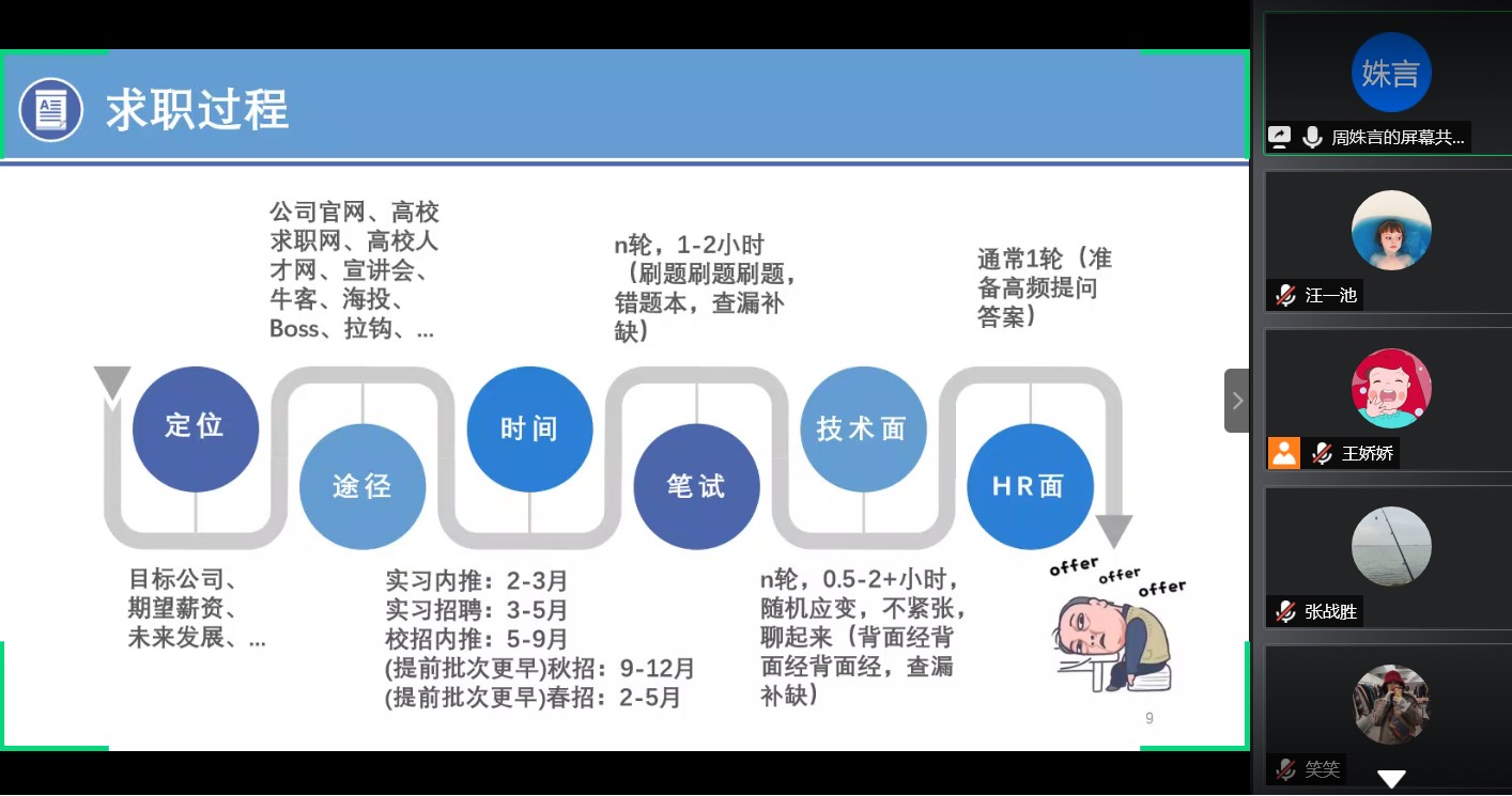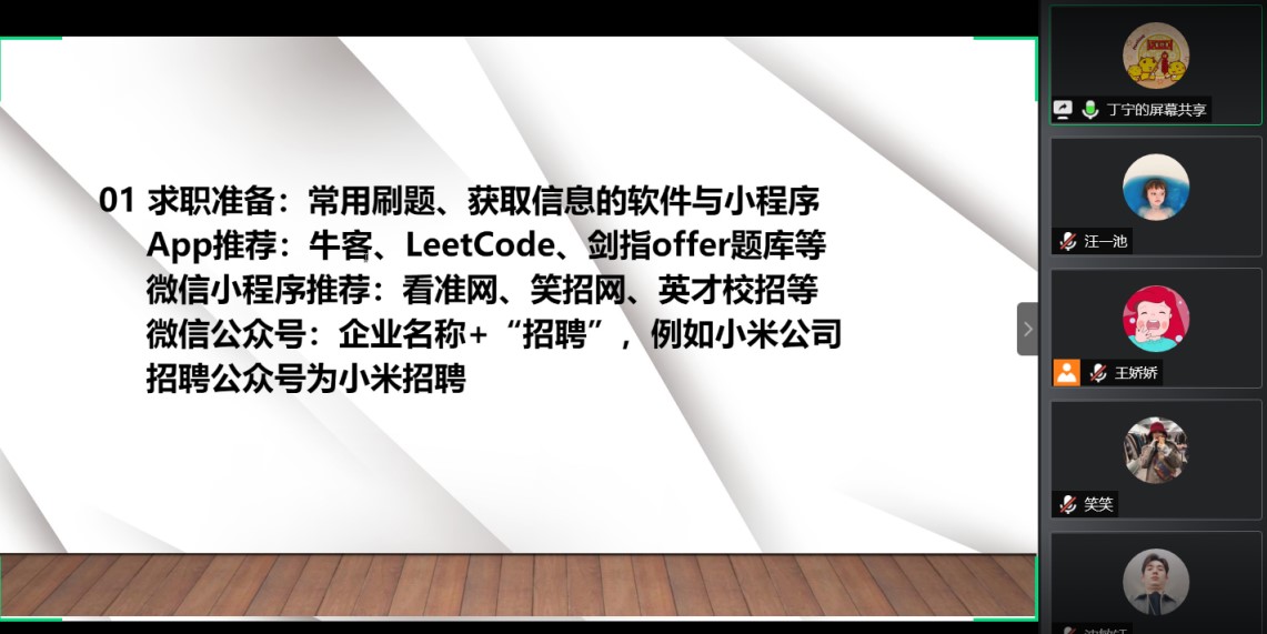 最后进行分享的是丁宁学长,学长先是给我们展示了目前热门的互联网公司像字节跳动、腾讯、百度等等职位以及编程语言的排行榜,接着给我们推荐了热门岗位所需要掌握的基础知识,告诉我们技术岗需要的是勤练习,还给我们分享了一些好用的求职网站,例如:牛客网、剑指Offer,等等,并且还举例说明了一些求职技巧,比如答不上来的题目可以选择回答相关的知识而不要直接说不知道,比如在回答面试官问题时不要给自己挖坑等等,让大家受益匪浅。