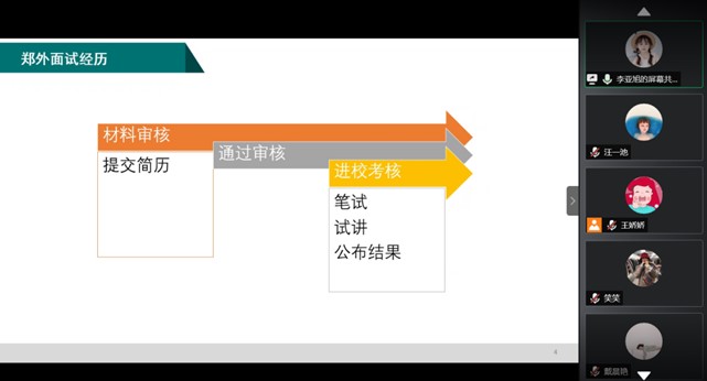 本次线上交流分享会共邀请了四位今年毕业的学长学姐进行求职经验分享,他们分别是2017级教育技术学毕业生刘欢欢学姐(厦门市市属高中,通用技术教师)、李亚旭学姐(郑州外国语新枫杨学校,高中信息技术老师),2018级现代教育技术学毕业生周姝言学姐(跟谁学-高途课堂(北京),前端研发工程师)、丁宁学长(映客科技,开发岗)。
