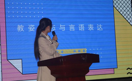 随后进行分享的是文学院的郑晓航同学,郑晓航从教学中可能遇到的细节问题入手,举出反例形象生动地说明了教姿教态、语言表达对教学效果的重要性。带领大家一同练习了有趣的绕口令体会用气、练声方法。并具体对服饰仪表、行为举止、肢体语言三个方面作出提示。郑晓航指出,教师的语言表达应标准明晰,简练精准,抑扬顿挫。良好的教姿教态可以对教学起到事半功倍的效果。
