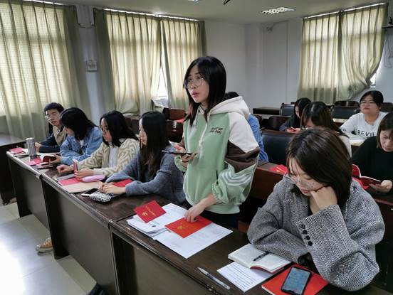 接着,支部成员结合自身对照党章党规展开学习和自我批评。熊莎莎同志指出自己在密切联系群众方面做得不足,平时可以做到自我批评,但是没有对身边人的不当行为进行批评指正,今后会多加改正。胡金龙同志认为自己在平时学习之余对自己有些放松,没有及时了解党的方针政策。汪双同志在履行党员义务方面对自己进行肯定,但是认为在自己在教育创新方面表现不足,身为党支部书记在通知信息方面不够及时和到位,会在之后的工作生活中更加严格要求自己。