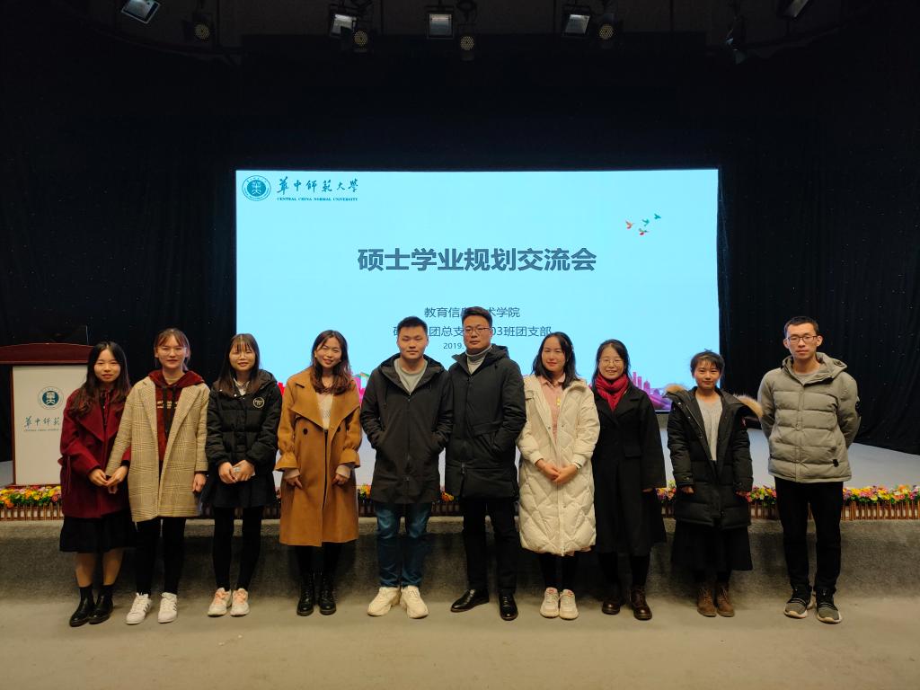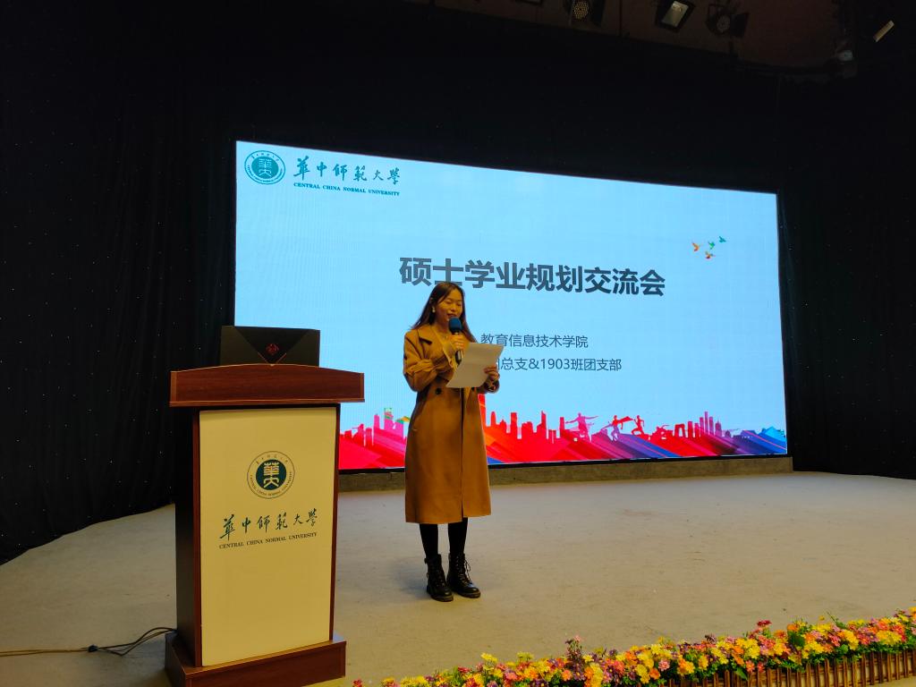 2019年11月28日下午4时,为帮助2019级硕士研究生尽快适应研究生生活,寻找榜样,尽快制定好自己在研究生阶段的目标和方向,教育信息技术学院研究生团总支在9号楼六楼演播厅举办第十一届研究生学业规划交流会。此次交流会由1903班团支部副书记李亚芳主持,2019级全体研究生参加。