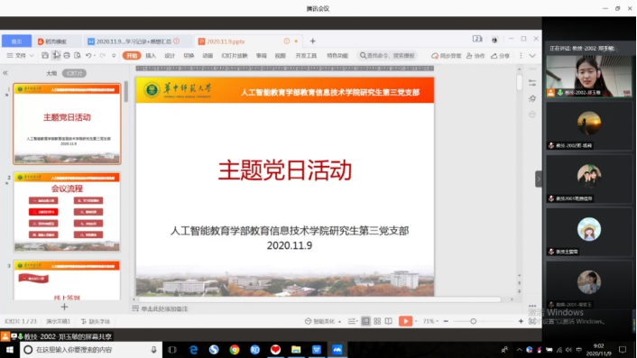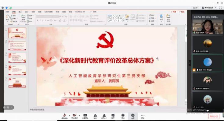 (通讯员姜雨薇)2020年11月9号,教育信息技术学院2020级硕士生第三党支部采用线上的形式开展了10月的主题党日活动,全体党员参与并学习了习近平总书记在纪念抗美援朝70周年大会上的讲话、十九届五中全会精神、《深化新时代教育评价改革总体方案》。会议由党支部书记郑玉敏主持。