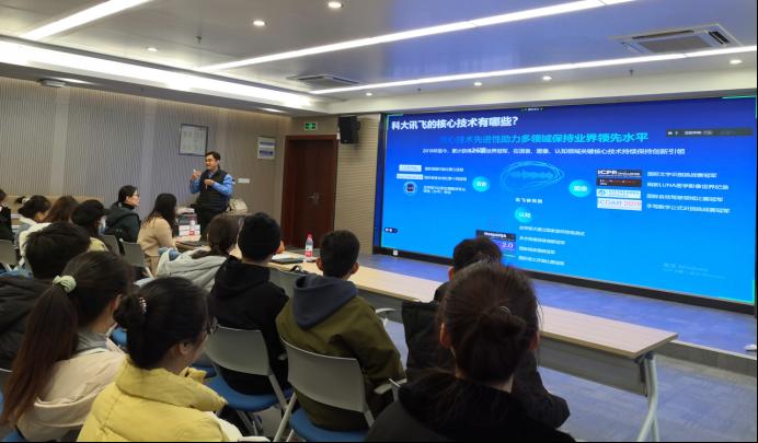 本次宣讲会主要包括公司情况简介、优秀校招生经验分享、现场问答三个环节。首先,由科大讯飞教研培训部负责人从AI助力教育均衡发展、助力师生减负因材施教、助力区域教育治理、助力考试高效公平四个方面对公司进行简要介绍,并对教育技术研究院、教研培训部等特色部门进行简单介绍,帮助应聘者全面了解该公司。