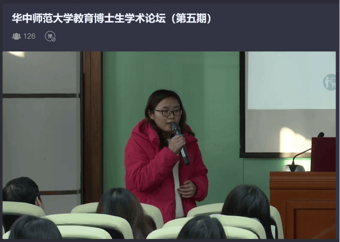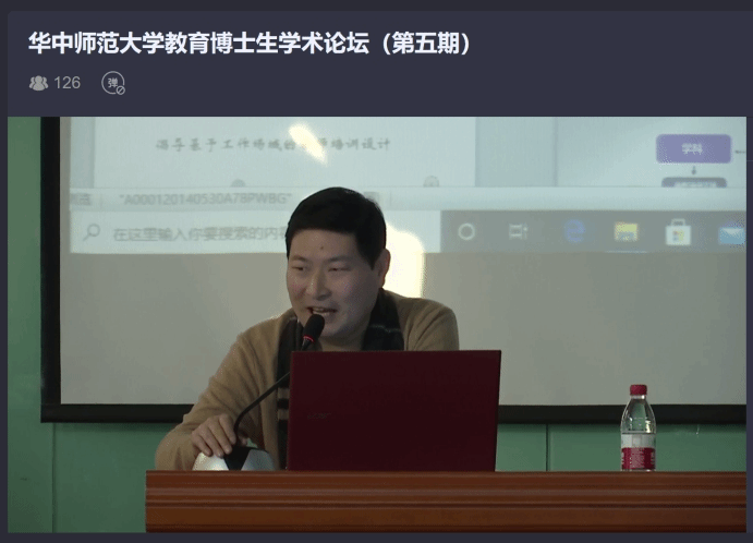 湖北省中小学教师继续教育中心研究员、教师教育学院博士研究生王金涛作了主题为《基于场域的教师专业发展支持研究》的汇报,王博士首先对“场域”进行简要介绍,接着介绍了倡导基于工作场域的教师培训设计,并回答了几位现场观众的问题。