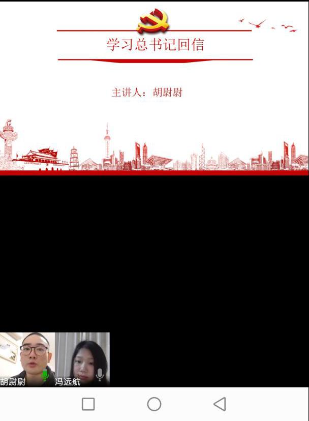 本次主题党日活动共有4个环节。首先,本科生党支部马育浦同志带领全体学习了习近平总书记考察武汉疫情防控工作时的重要讲话精神,结合我校优秀校友刘洁和华雨辰的事迹表达了爱在华师、爱在武汉、爱在中国的精神,强调大家在做好自我防护、听从指挥、遵守纪律的同时,积极为疫情防控奉献自己的力量。冯远航同志以“英雄就是平凡人挺身而出”这句话进行了总结。本科生党支部胡尉尉同志带领大家学习了习近平总书记给北京大学援鄂医疗队全体“90后”党员的回信。习总书记这封回信是对青年一代的肯定,更是对青年一代的激励。胡尉尉谈到,我院青年学子积极参与一线防控、线上支教等志愿服务工作,这也是青年大学生的一种作为和担当。