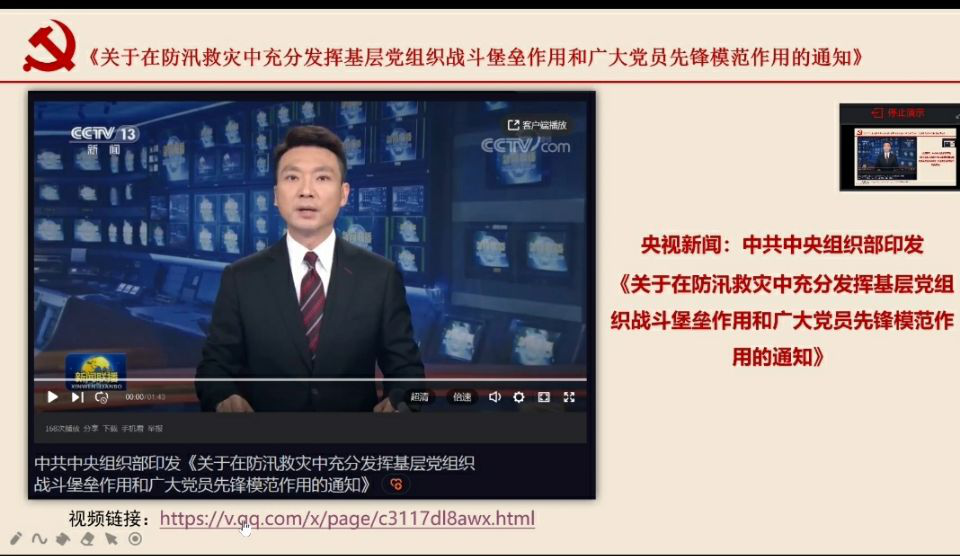 首先,本科生党支部书记冯远航带领大家以关键句的形式学习了《关于在防汛救灾中充分发挥基层党组织战斗堡垒作用和广大党员先锋模范作用的通知》精神,接着以防汛救灾的新闻片段阐述文件的重要意义。