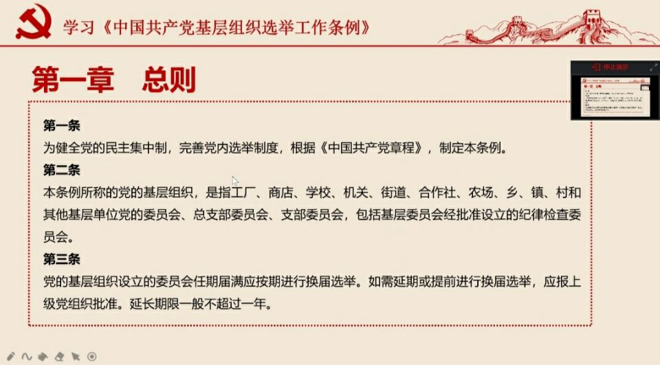 主题党日学习活动的第二部分,由冯远航带领大家观看了《中国共产党基层组织选举工作条例》解读视频,并以关键词句的形式说明重点难点。