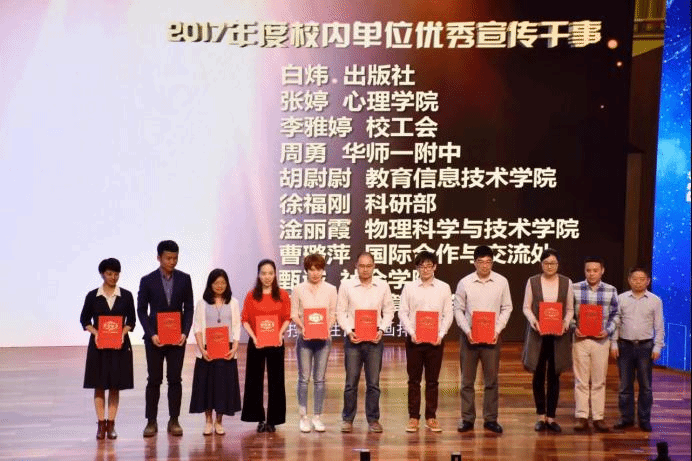 出席盛典的领导为“十佳中英文网站”“十佳官方微博”“十佳官方微信”“十佳学生组织新媒体”“十佳自媒体”“十佳新媒体指导老师”以及“2017优秀宣传干事”等获奖单位及个人代表颁奖。我院英文网获“十佳中英文网站”荣誉,院党委副书记钟文锐代表学院领奖。我院宣传干事胡尉尉老师获2017年度校内单位优秀宣传干事奖。
