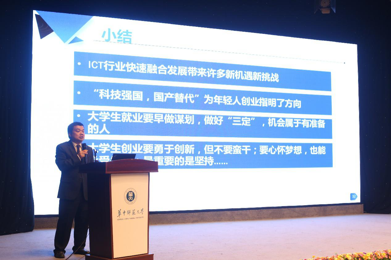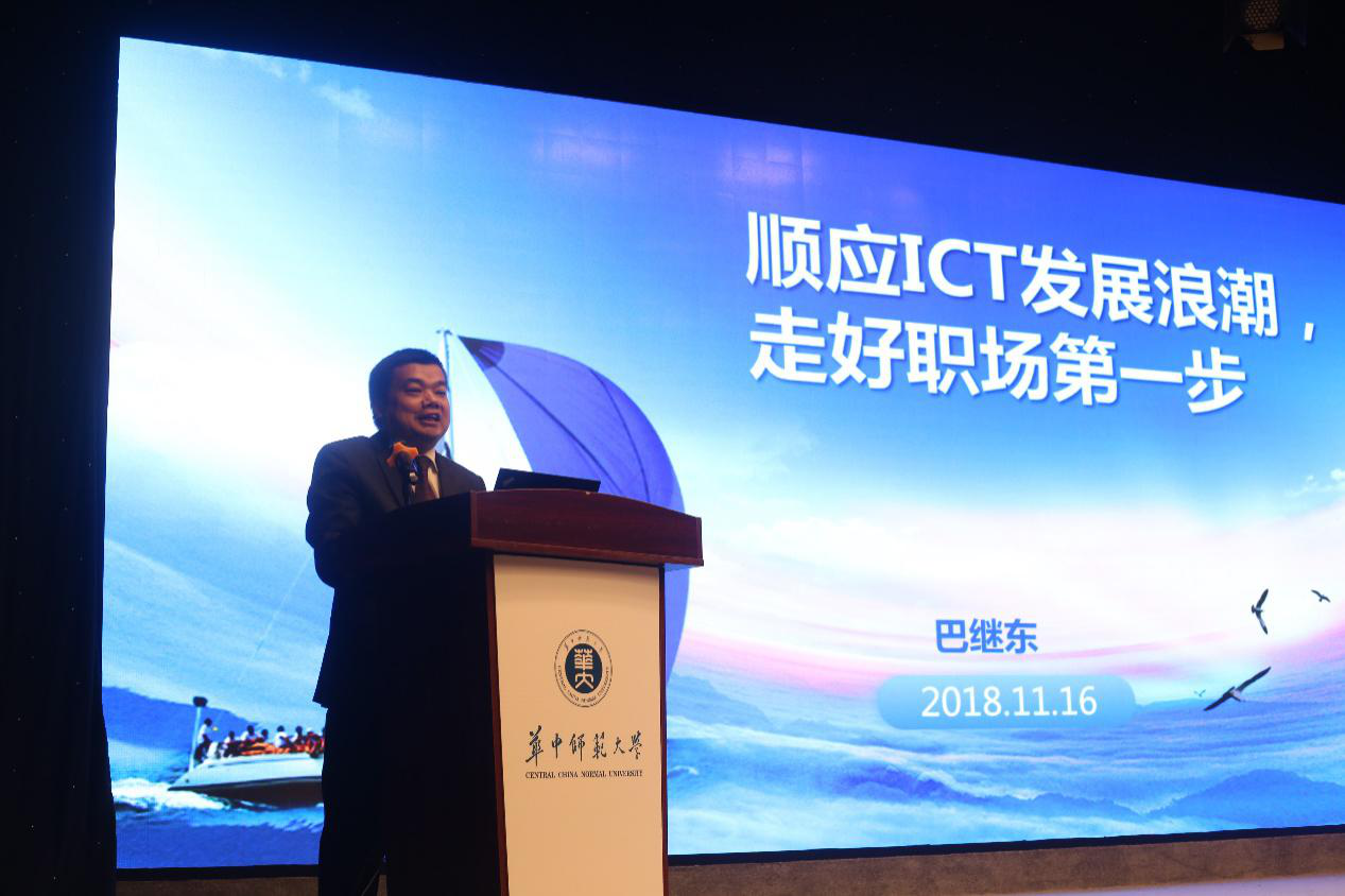 教育信息技术学院讯(见习记者 胡容鸣)为帮助学生了解信息通信科技行业发展,增强学生职业生涯规划意识,学习校友在职场努力拼搏的精神,11月16日下午,由华中师范大学招生与就业工作处主办 、教育信息技术学院承办的第三期就业大讲堂“顺应ICT发展浪潮,走好职场第一步”在九号教学楼6楼演播厅顺利举办。本次讲座同时为2018年讲好信技故事校友专场,由教育信息技术学院(原信息技术系)教育技术学专业1993级校友,中国信息通信科技集团武汉长江通信智联技术有限公司董事、总经理巴继东先生主讲。信技学院党委副书记钟文锐出席,院团委书记胡尉尉以及来自全校一百多名学生参加了讲座。