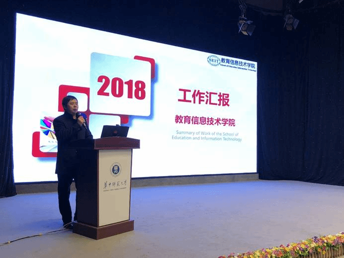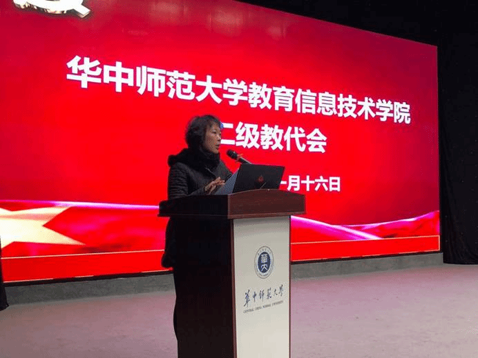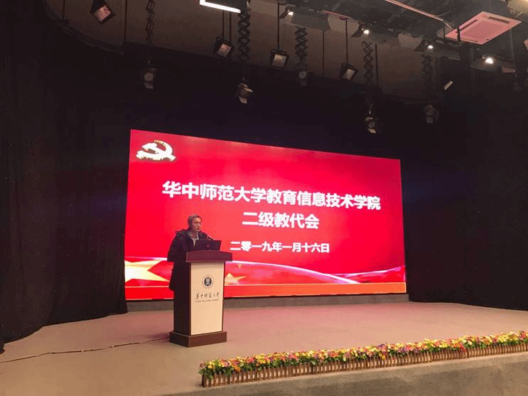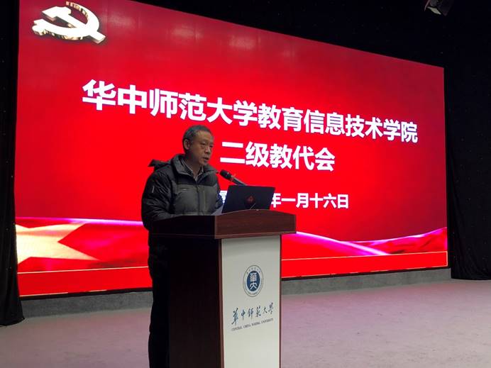 会议由教育信息技术学院工会主席宁国勤教授主持,共有五项议程。首先,由常务副院长刘清堂教授代表学院党政领导班子作2018年度学院工作报告并介绍2019年工作计划。工作报告主要围绕学科建设、人才培养、科研与社会服务、实验及条件保证和党建思政管理等方面展开。随后,杨九民副院长对新起草的《教育信息技术学院关于进一步加强和改进师德建设的实施办法》、《教育信息技术学院教职工聘期考核办法》、《教育信息技术学院教职工年度履职考核工作方案》三个制度的起草依据、主要内容、征求意见等情况作出说明。