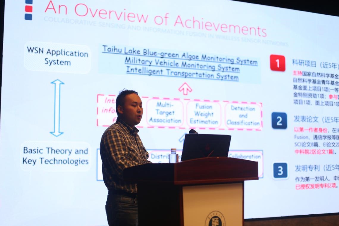 本次论坛共有3位青年学者进行报告展示。每名应聘者结合研究领域自行选定主题陈述25分钟。他们逐一拿出“看家本领”,通过作学术报告并接受现场论坛问答,展示个人研究能力。第一位报告人为肖克江博士,在汇报前数字媒体系副教授王志峰对肖克江做了简要介绍。肖克江于2015年在中科院计算所获工学学位,研究方向为物联网,2015年毕业后加入湖南省国网电力公司信息通信公司担任高级工程师。他以“传感网络协同感知与信息融合”为题,从研究成果、成果目录、教学科研规划作了汇报。随后王志峰对汇报进行了简要的总结及拓展。