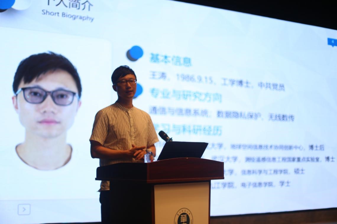 第二位报告人为王涛博士,汇报前由教育技术系副教授邓伟对王涛做了简要介绍。王涛2015年毕业于武汉大学遥感信息工程国家重点实验室通信与信息系统专业,在武汉大学空间信息技术协同创新中心从事博士后研究,研究邻域为大数据隐私保护。王涛从个人简介、研究内容及未来计划作了汇报。