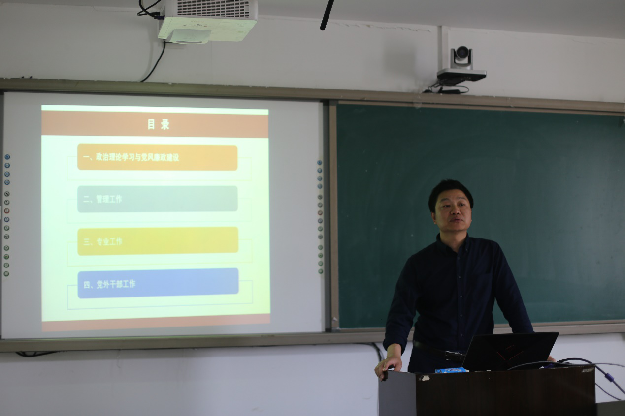 会议第一阶段,举行学院党政班子及班子成员述职述廉。首先,由常务副院长刘清堂代表班子进行学院2018年工作汇报,他从学院建设、人才培养、科研和社会服务、党建思政管理、财务预算和决算等方面出发,对在这一年度工作中取得的成果和不足之处进行了详细清晰的数据化总结分析,明晰学院的发展方向。随后他进行了个人2018年度述职述廉,汇报了个人分管工作情况以及教学科研等情况。