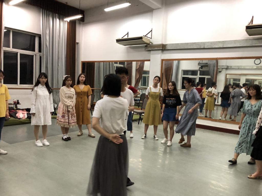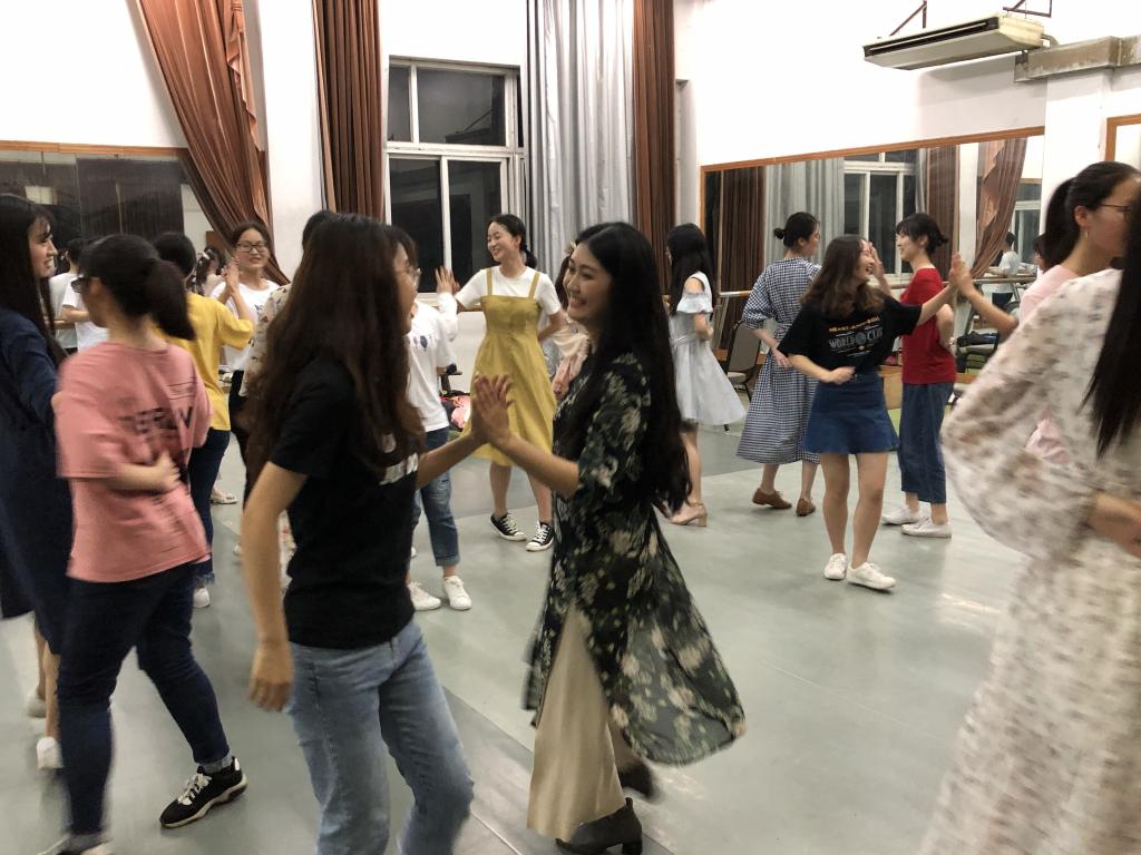 随后,郭晓丽以传沙蛋的方式,让学员们把握节奏感。教学过程中,郭晓丽与郝文通过示范表演及基本舞步的教学,让学员们逐渐掌握华尔兹舞蹈的基础,教学过程中引导学员们放松心情。