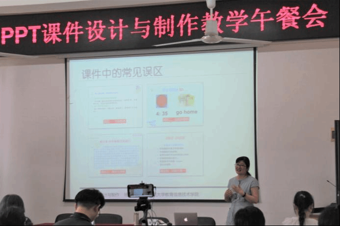 教育信息技术学院讯(记者 王雨欣) 2019年6月14日(周五)中午12:00在教师教育学院A501,我校教师教学发展中心举办主题为PPT课件与制作的教师午餐会,邀请我院杨琳老师主讲。我院工会积极动员,众多女教职工参与本次活动。