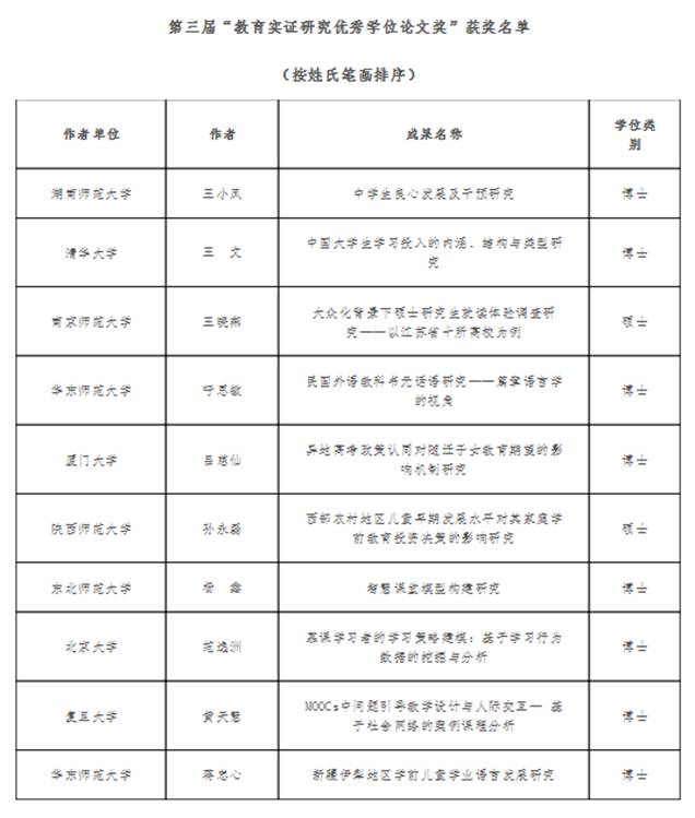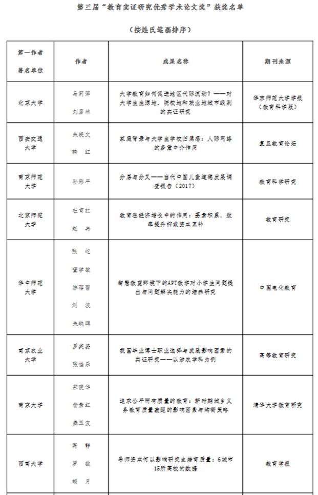 据悉,第三届“教育实证研究优秀成果奖”评选活动于2019年5月5日拉开序幕,由华东师范大学教育学部、北京师范大学教育学部、全国教育科学规划办公室等共同举办。经高校教育学院(部)、重要教育研究杂志及教育研究院所等78家单位推荐,共有209篇学术论文、84篇学位论文参评。在推荐人和被推选人共同对推荐成果进行通讯评审后,共有36篇学术论文、20篇学位论文进入第三轮评审。2019年10月18日,第三届“教育实证研究优秀成果奖”评审会于华东师范大学举办,评审专家委员对每项参评成果进行实名制评审,评出票数最高的10篇优秀学术论文和10篇优秀学位论文。评审结果如下: