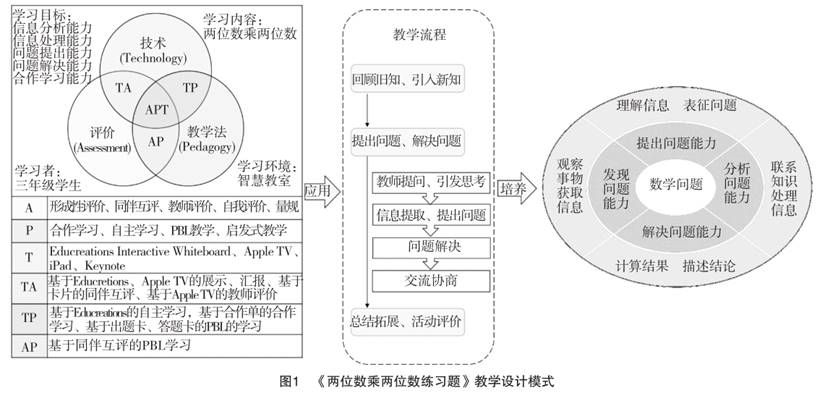 文章依托教育部人文社会科学研究规划基金项目“智慧教室中促进小学生深度学习的教学策略研究”,以华中科技大学附属小学三年级数学课《两位数乘两位数练习题》为例,围绕培养学生问题提出与问题解决能力的目标,通过设计多元化教学评价体系,运用多样化教学方法,利用多种信息技术工具,对智慧教室环境下基于APT教学模型的课堂教学开展实证研究。APT教学模型即融合评价手段(Assessment)、教学方法(Pedagogy)和技术工具(Technology)等要素,倡导“以评促学”的教学理念,依据教学目标、学习者特征和教学内容特征的综合分析结果,选择合适的评价手段、教学方法和技术工具,以实现课堂教学效果的提升和学生学习方式的转变,促进教师信息技术应用能力的发展,培养21世纪学习者需具备的信息技术应用能力、主动学习能力和合作与创新能力。基于APT教学模型的教学设计模式如图1所示。