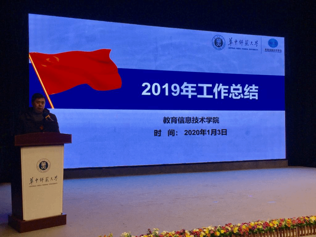 首先,刘清堂向大会介绍了学院在2019年取得了教育技术学国家级一流专业、本科生党支部获教育部“第二批新时代全国党建工作样板支部”称号等突出成果,总结了学院全年在学科及师资队伍建设、专业建设与人才培养、科学研究与社会服务、国际化工作及党建思政管理等方面目标任务完成情况,提出了2020年学院工作规划,号召全体教职工要为实现新年度工作目标共同努力。最后他就2019年底绩效分配事宜进行了介绍。