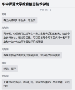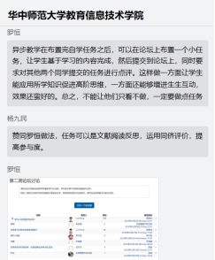 随后,两位老师还回答了老师们的提问,就线上教学的时间控制、教师教学活动设计时长、小组合作的成效、课后任务检测等问题进行了交流讨论。会后,大家还在企业微信群进行了热烈而深入的探讨,表示将充分发挥专业和技术优势,更好地完成在线教学任务。