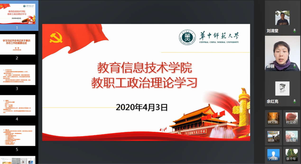 4月3日下午,我院以在线会议的形式召开全体教职工大会,总结前期工作,部署下步工作重点,举行了4月份教职工政治理论学习。院党政班子成员和全体教职工参加,会议由院党委书记游丽主持。