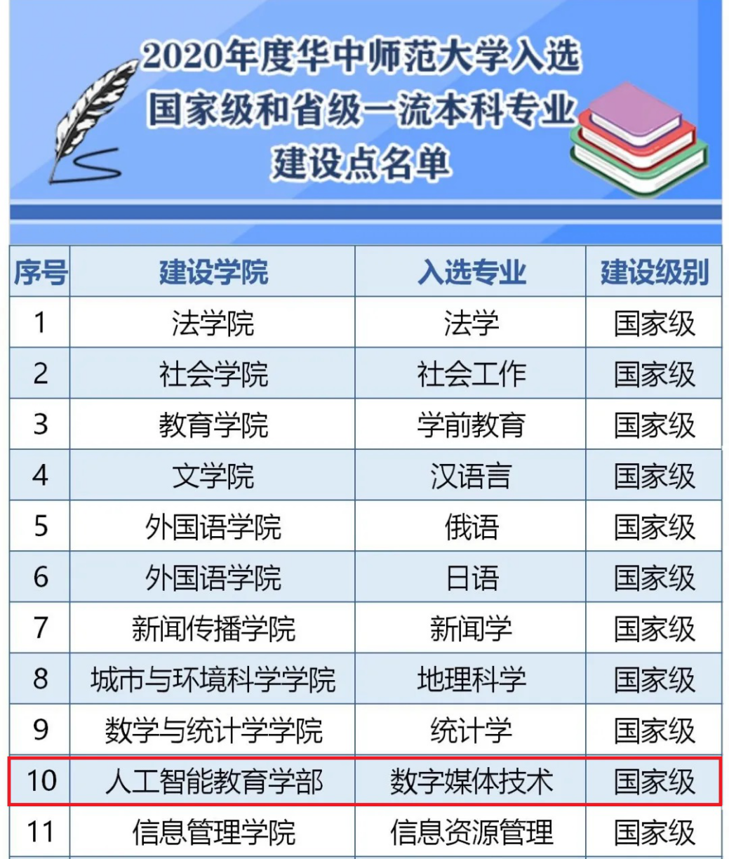 人工智能教育学部讯(记者刘思源)日前,教育部正式公布2020年度国家级及省级一流本科专业建设点名单,我校20个本科专业获批,其中学部数字媒体技术专业获批国家级一流本科专业建设点。