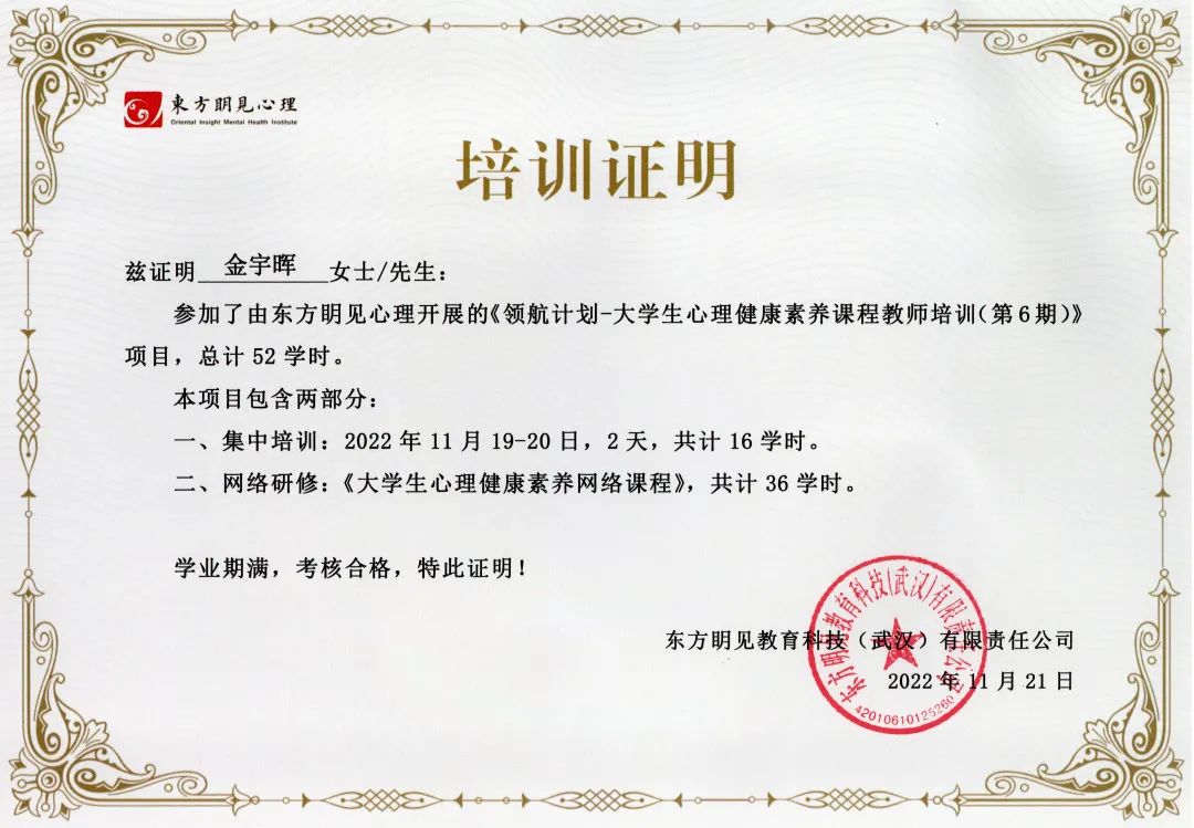 学部政工干部2022年全年参与各类心理健康业务基础培训培训达63人次,在学工部的支持下,金宇晖、汪双、王瑞三位辅导员顺利通过《领航计划—大学生心理健康素养课程教师培训(第六期)》考核。