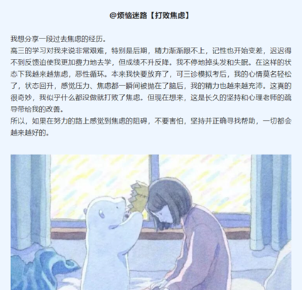 为加深同学情谊、促进师生和生生交流、营造温馨有爱的校园氛围,心理工作站开启了“分享树洞”,收集同学们的投稿,作为学生交流和分享的平台,引导学部同学保持健康阳光的心态。