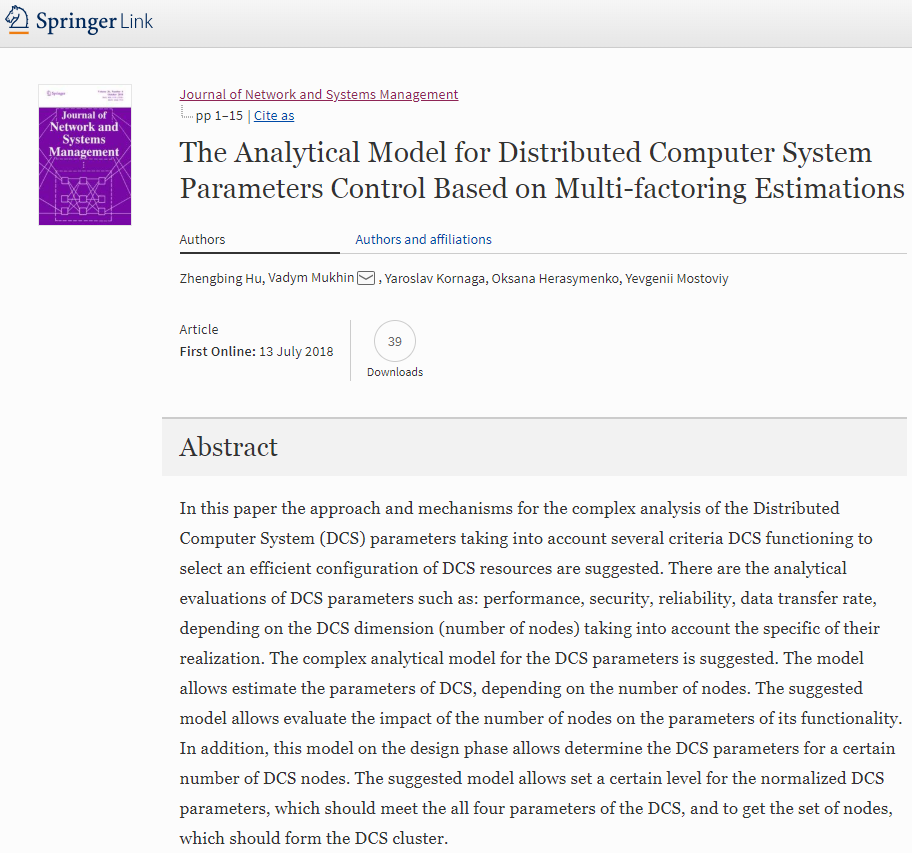 论文《The Analytical Model for Distributed Computer System Parameters Control Based on Multi-factoring Estimations》该研究提出了分布式计算机系统(DCS)参数的复杂分析的方法和机制,其考虑了DCS功能以选择DCS资源的有效配置的若干标准。有DCS参数的分析评估,例如:性能,安全性,可靠性,数据传输速率,取决于DCS维度(节点数量),并考虑其实现的具体情况。建议使用复杂的DCS参数分析模型。该模型允许根据节点数估计DCS的参数。建议的模型允许评估节点数对其功能参数的影响。此外,该设计阶段的模型允许确定一定数量的DCS节点的DCS参数。建议的模型允许为归一化的DCS参数设置一定的级别,该参数应该满足DCS的所有四个参数,并且获得应该形成DCS群集的节点集。该研究得到中央高校探索创新项目(CCNU16A02015)资助。胡征兵老师为该论文第一作者,华中师范大学为第一完成单位。文章地址:https://link.springer.com/article/10.1007/s10922-018-9468-x