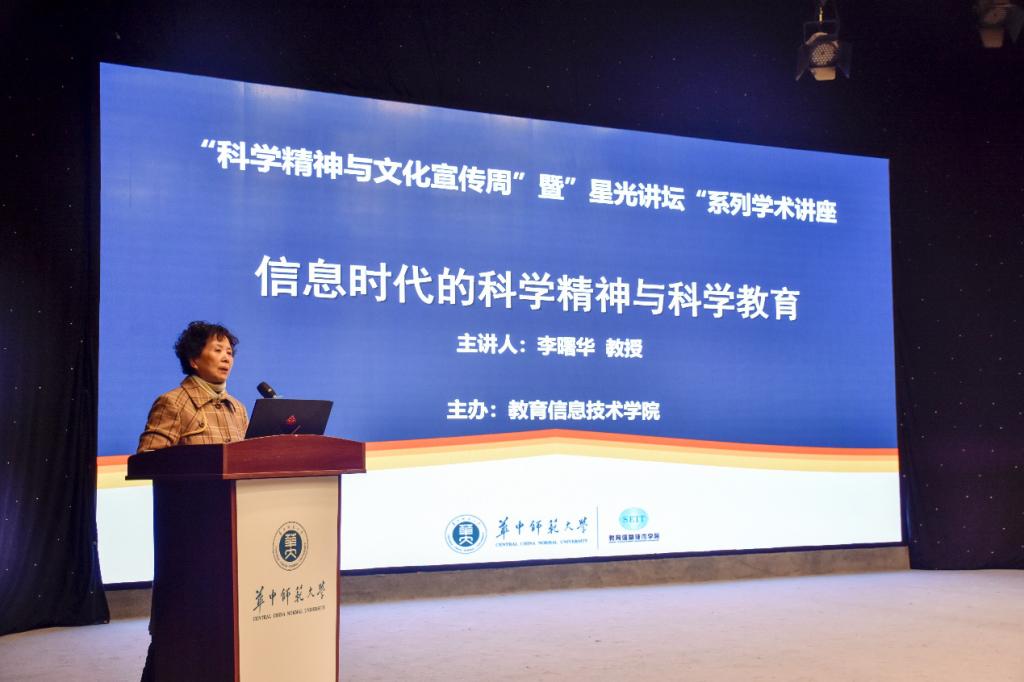 教育信息技术学院讯(通讯员 段福晓)12月5日上午,首届“科学精神与文化宣传周”暨“星光讲坛”系列学术讲座——信息时代的科学精神与科学教育主题讲座于九号楼六楼演播厅举行。此次讲座由南京大学哲学系教授、科学哲学博士生导师李曙华教授主讲,南京大学教育研究院教授桑新民、我院党委书记游丽出席本次活动,我院科学教育与传播系主任郑旭东教授,我院部分教职工及科学教育与传播系研究生、本科生参加本次讲座。