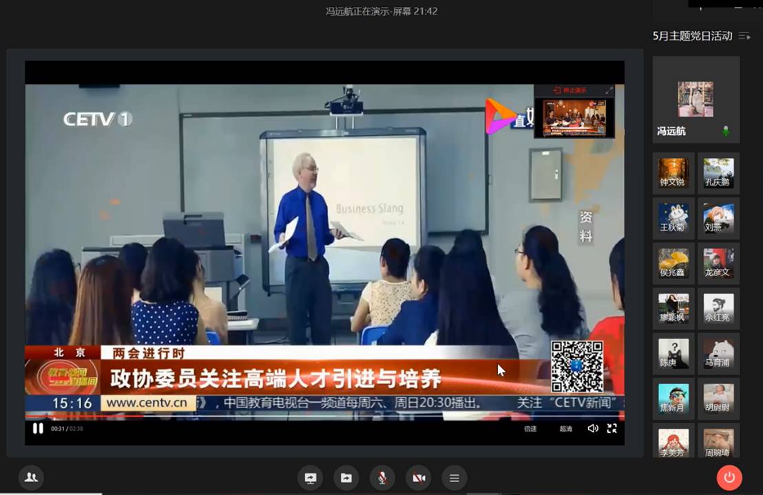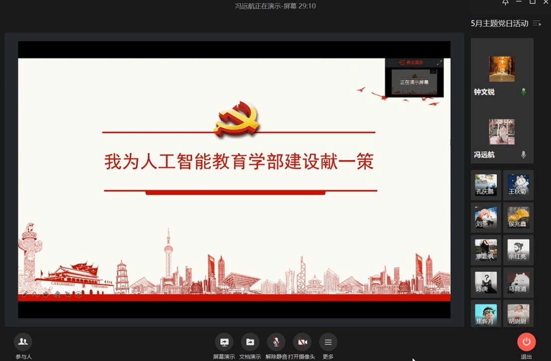 2020年5月29日下午3点,我院本科生党支部和行政党支部通过企业微信联合开展5月线上主题党日活动,本次主题党日活动共有2个环节:学习讨论2020年“两会”精神和我为人工智能教育学部建设献一策。活动由院党委副书记、行政党支部书记钟文锐主持,院党委书记游丽以普通党员身份参加学习,行政党支部、本科生党支部全体党员参加。